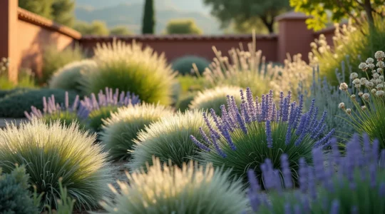 Además, muchas gramíneas mantienen interés visual incluso secas durante el invierno, cuando sus inflorescencias doradas capturan la luz rasante. Un simple grupo de Stipa tenuissima plantado en masa crea un efecto de ola dorada que contrasta magníficamente con el follaje verde oscuro de arbustos mediterráneos.
